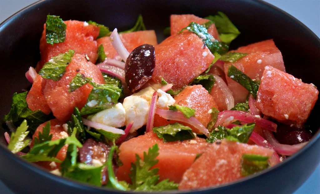 With the hot weather we’ve been having, it was a welcome return to a favorite: Nigel Lawson’s watermelon, feta and black olive salad. It’s a summer regular and very, very good.